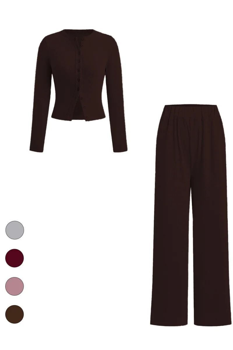 Das Ensemble besteht aus einer leichten Strickjacke und einer weit geschnittenen Hose , die die Figur vorteilhaft betont und gleichzeitig ein Gefühl absoluter Bewegungsfreiheit vermittelt. Perfekt für die intimen Momente der Feiertage: Geschenke auspacken, Weihnachtsfrühstück oder einen entspannten Tag zu Hause.